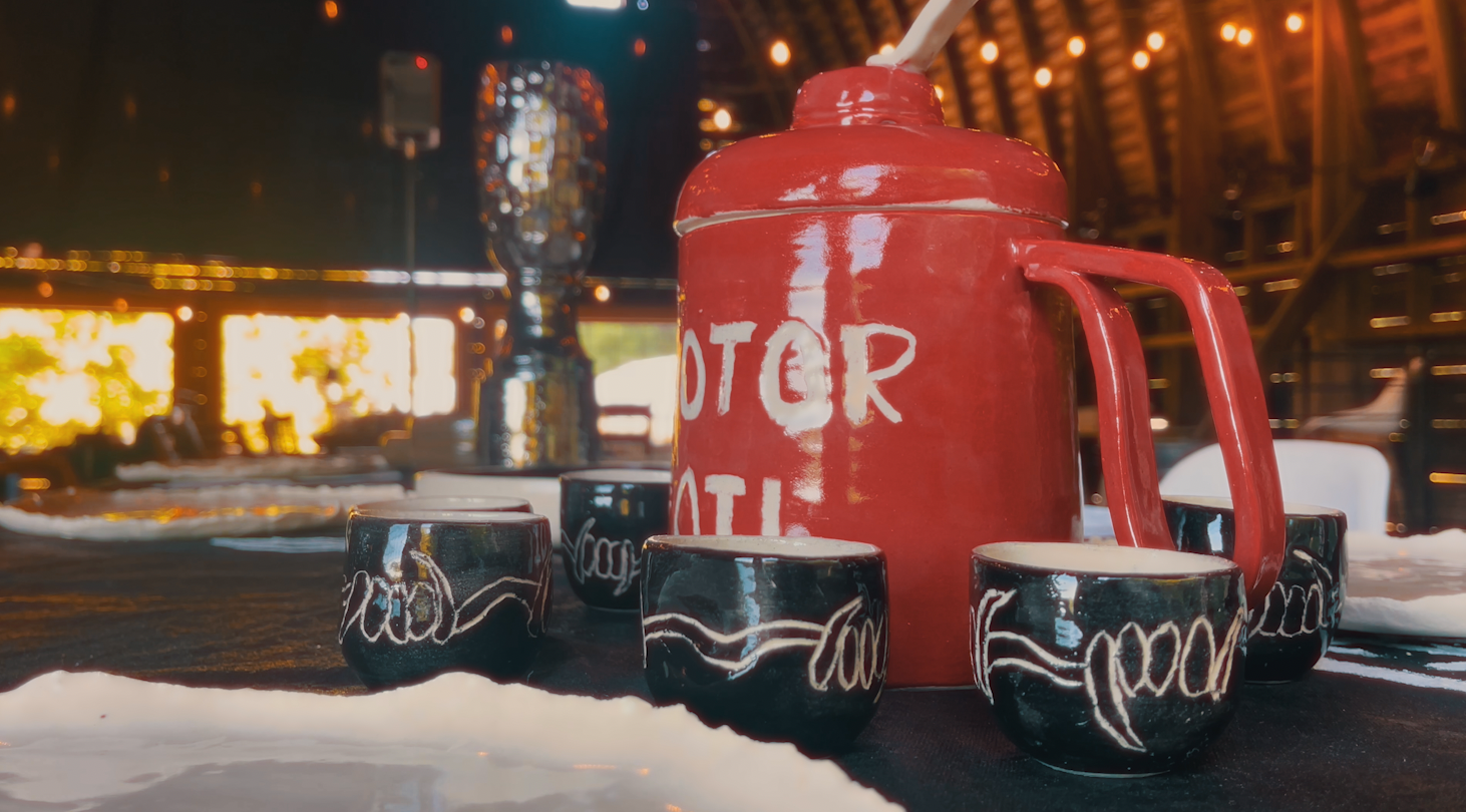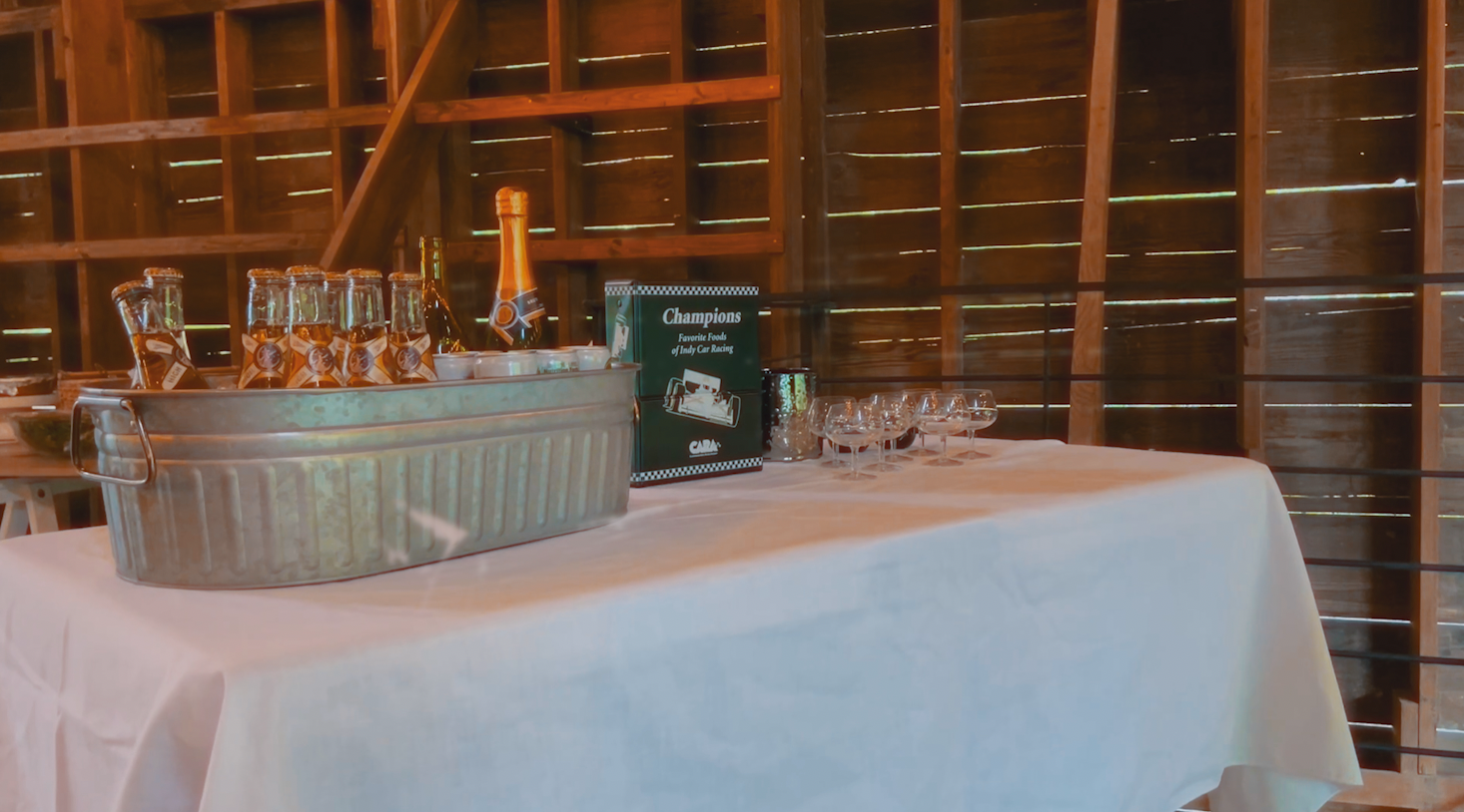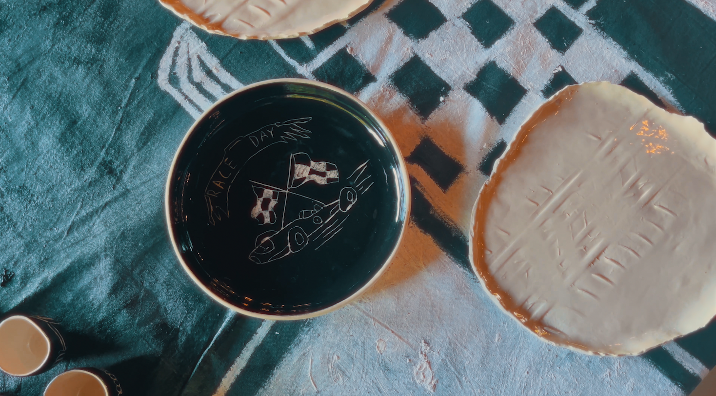 Inspired by Indycar Racing — custom, hand-made ceramics mimic oil cans and the iconic Borg-Warner Trophy, while shot glasses serve buttermilk shots in a playful nod to victory traditions. Paintings double as tablecloths, while tire-engraved plates anchor each guests place at the table alongside hand-stamped shop rags serving as dinner napkins. Drawing from the 1993 Championship Auto Racing Auxiliary (Cara) Indycar Cookbook, the menu pays homage to motorsport history through food using actual race car driver’s recipes. Set in a restored, early 1900’s barn, the dinner invites a gathering of multidisciplinary artists and racing enthusiasts to share meal celebrating creativity through the intersection of art and motorsport culture.